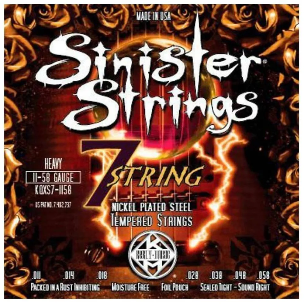 Kerly Sinister Stringsare nickel wound, heavy-gauge guitar strings seasoned between -320F and-350F for 24 hours to reduce the micro-cracks that cause tonal loss andpremature breakage. Thanks to the repetitive HOT/COLD temperingprocess, the micro-cracks close up, preventing the buildup of dirt andcorrosion. Strength, sound, and string life are enhanced. Set of 7guitar strings.Feeling a heavy gauge string underneath your fingertipsgives you extra power while cutting through with an unmistakable growland chunk. These tonal flavors are a necessity for hard hitting,drop-tuned riffs, and passion-driven playing. Thermal cycling increasesdurability and dramatically reduces wear.