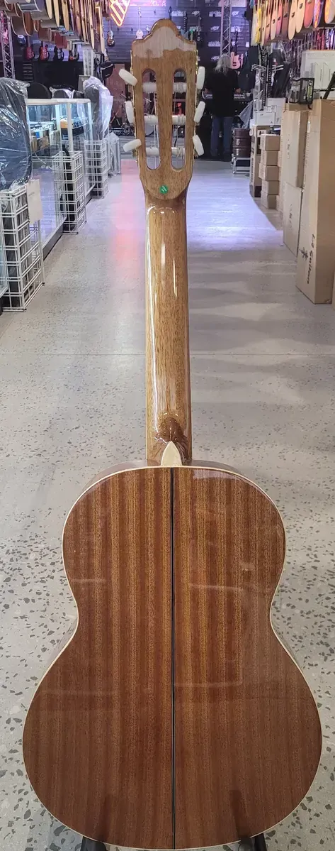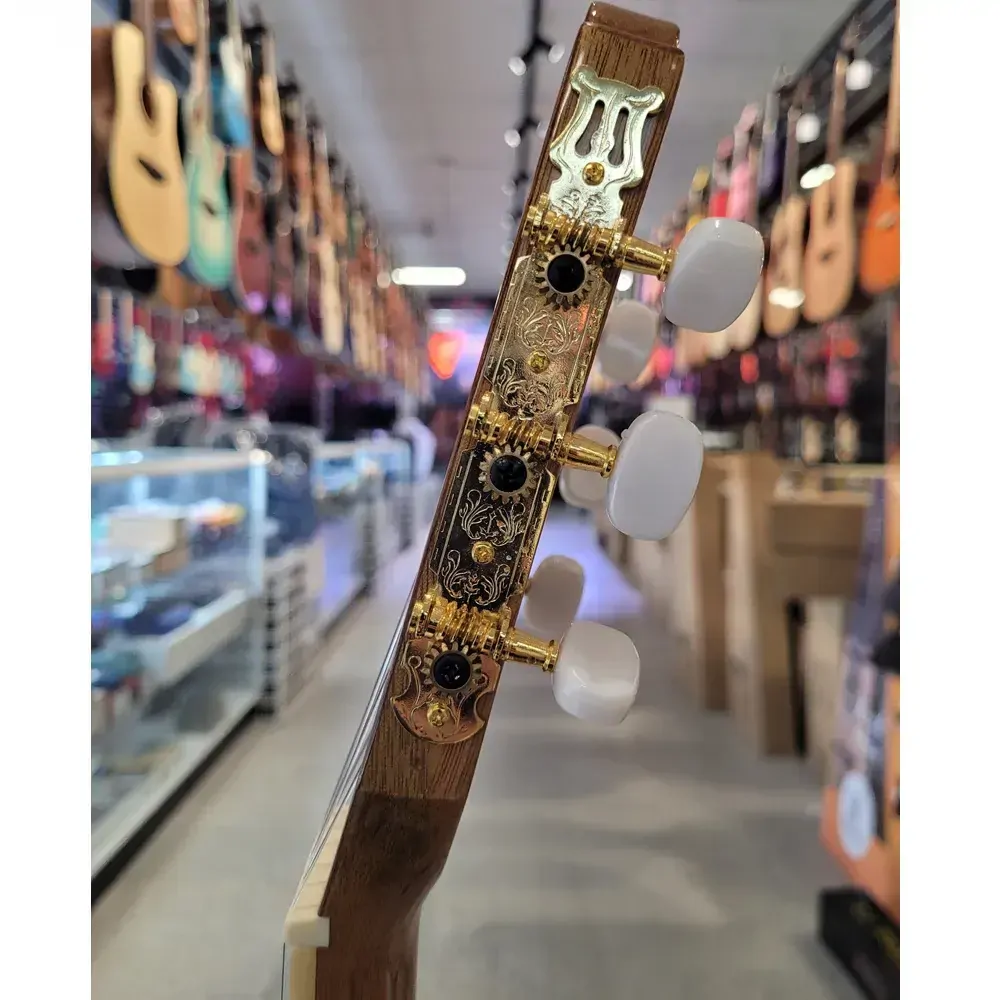Unlike many entry-level classical guitars, this model features an adjustable truss rod, allowing for better neck stability and long-term setup control. The nylon strings provide a softer feel on the fingers, making it ideal for learners, while the gold machine heads add a touch of traditional elegance and smooth tuning performance.
