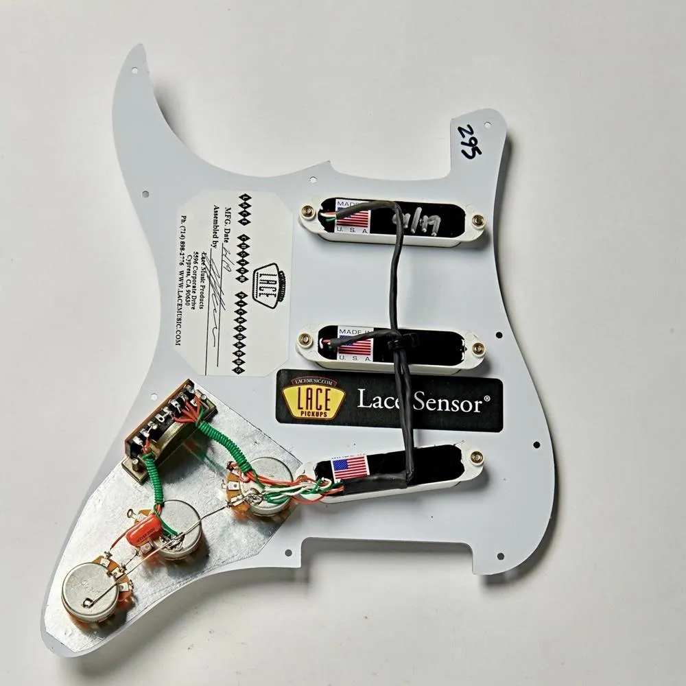 Lace Loaded Pickguards are pre-wired with quality components (250K full size pots, USA-Made switch, NTS Caps) all on a 3-ply pickguard. Includes knobs and switch knob. Designed to drop-in to your Strat and connect with only 2 wires. Call your local Lace retailer for custom configurations and colors.