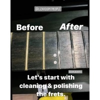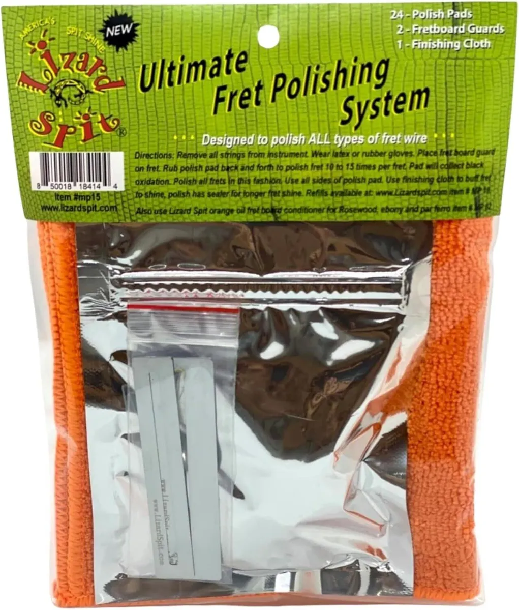 MP15 – FRET POLISHING KIT quickly cleans frets with barrier protectant that seals fret wires to stop oxidation. Features easy-to-use disposable polishing pads. Includes 2 fret guards, 24 pack of polish pads and microfibre cleaning cloth.