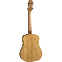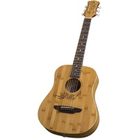 - 3/4 dreadnought travel acoustic featuring a bamboo top, back, and sides, as well as a bamboo leaf laser etching around the soundhole