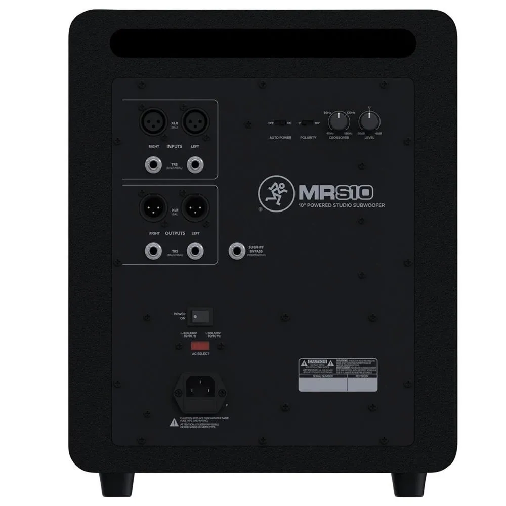 Mackie MR series studio monitors deliver extreme clarity with plenty of output and responsive, dynamic lows. But if you're working on hip-hop, EDM, or any other bass-heavy project, you'll need more low-end extension. Enter the MRS10. This powered subwoofer pumps 120 chest-thumping watts through a 10" glass-aramid-composite woofer, bolstering your low-end performance, increasing your SPL capabilities, and optimizing your studio by allowing your mains to focus on mids and highs. An adjustable crossover and switchable polarity make integrating the MRS10 into your studio easy. Complete with an eye-catching all-wood cabinet, the MRS10 looks as great as it sounds.