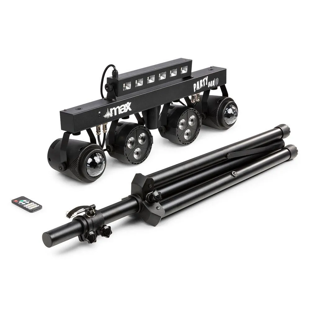 The MAX PartyBar Series consists of a number of complete kits fitted with spectacular LED light effects. All sets are provided with high-intensity LEDs in different colours. This series of Party Bars is plug and play and can be controlled via DMX, IR remote control or auto and sound-activated programs selectable from the control panel with LED display and push buttons. A tripod stand is included for quick and easy setup. Specially designed for stages, parties, entertainers and all other special events.