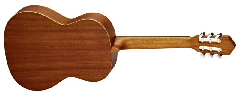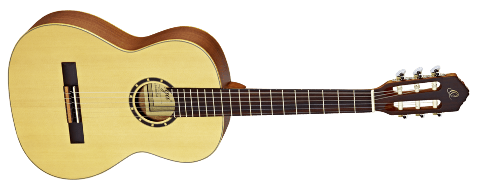 The Ortega Family Series of nylon string classical guitars are designed to fit the needs of everyone at every age and every skill level. There is a large selection of body sizes from a quarter to full size, different colours and neck widths. Features such as the 12-hole bridge that are usually only found on the best top end classical guitars, are part of Ortega’s standard entry line, such as here.