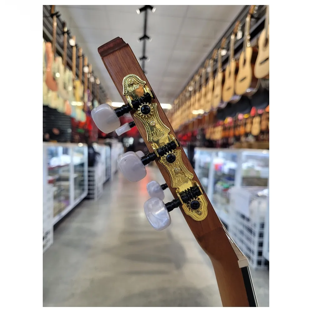 ORTEGA 12-hole bridge: The ground-breaking improvement for sound; tuning stability and faster response of the guitar top.