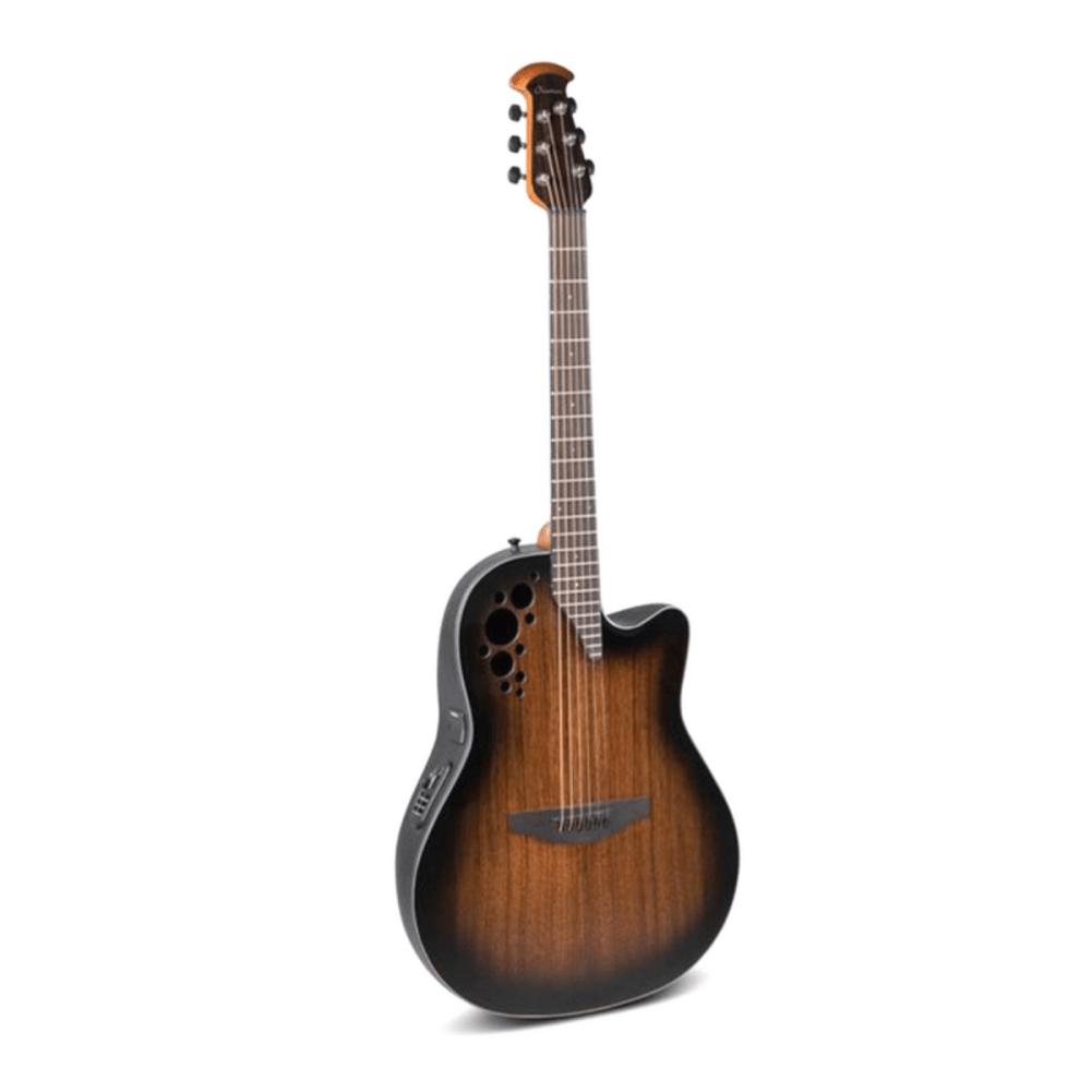 The overall playability and pristine live sound of the Celebrity Collection Elite is visually enhanced by the stunning exotic wood top of the Celebrity Collection Elite Exotic guitar. Featuring Ovation's unique multi-soundhole design, this guitar delivers clear highs and a focused, balanced bass response. The patterned exotic Koa wood top features detailed laser-cut epaulets that complement the unique look and provide acoustically remarkable tone clarity. The mid-depth Lyrachord composite body is comfortable and offers excellent projection when standing or sitting. The satin neck, Ovangkol fretboard and bridge work together to deliver effortless, responsive playing. Celebrity Elite is equipped with an Ovation Slimline cartridge and OP-4CT preamp system with three-band EQ, volume/gain control, built-in tuner and battery level indicator, making it easy to fine-tune your sound. Whether you're playing on stage, in church or in the garage, the Elite delivers the classic Ovation Elite sound: articulation and balance, projection and subtle tonal complexity.