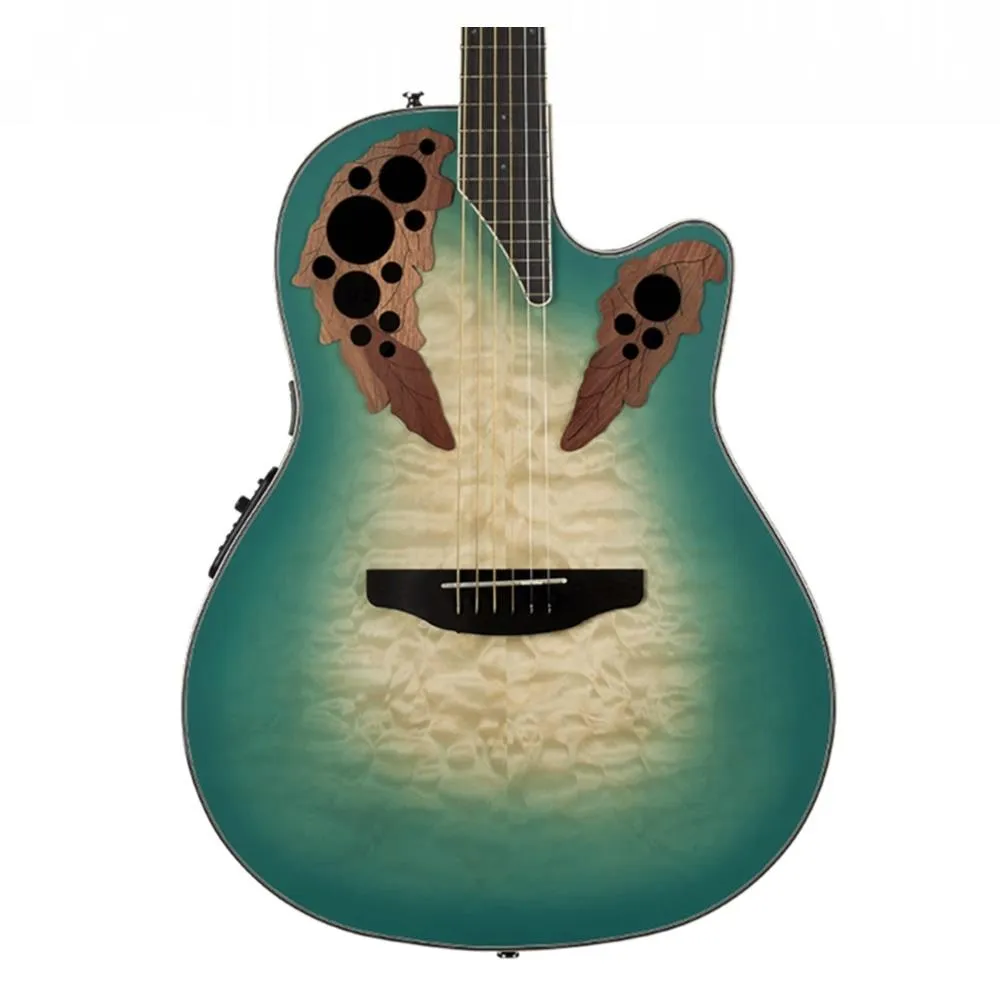 All of the playability and pristine live sound of the Celebrity Collection Elite is visually enhanced with a stunning top of exotic wood for the Celebrity Collection Elite Exotic guitars. This performance-ready guitar with Ovation's distinctive multi-soundhole design give you clear highs and a focused, balanced bass response. The uniquely figured quilted maple exotic top features a cool Mint Green to Natural Burst finish and detailed laser-cut epaulets that add to the striking appearance and sonic clarity. The Lyrachord® composite, mid depth body is comfortable standing or sitting and provides excellent projection. A satin-finished neck, Ovangkol fretboard and bridge all combine to make playing effortless and responsive. The Celebrity Elite is equipped with an Ovation Slimline pickup and OP-4CT preamp system featuring a three-band EQ, volume/gain control, onboard tuner and low-battery light that make it easy to dial in your sound. Whether you perform on stage, in church or in the garage, your Elite delivers the classic Ovation Elite sound: articulation and balance, projection, and nuanced tonal complexity.