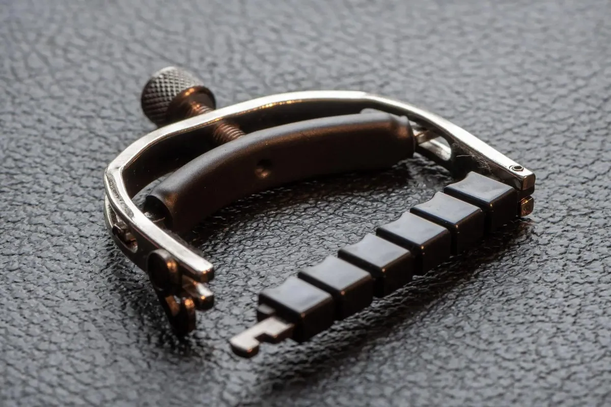 Innovative Design: The Paige capo is known for its distinctive, lightweight, and durable design. It simplifies the process of attaching and changing frets with remarkable ease, making it exceptionally user-friendly. Moreover, this capo features a practical innovation that allows you to store it conveniently above the nut, ensuring you never misplace it. Its controlled tension capabilities are crucial for maintaining your instrument's tuning, preserving the integrity of your performance.