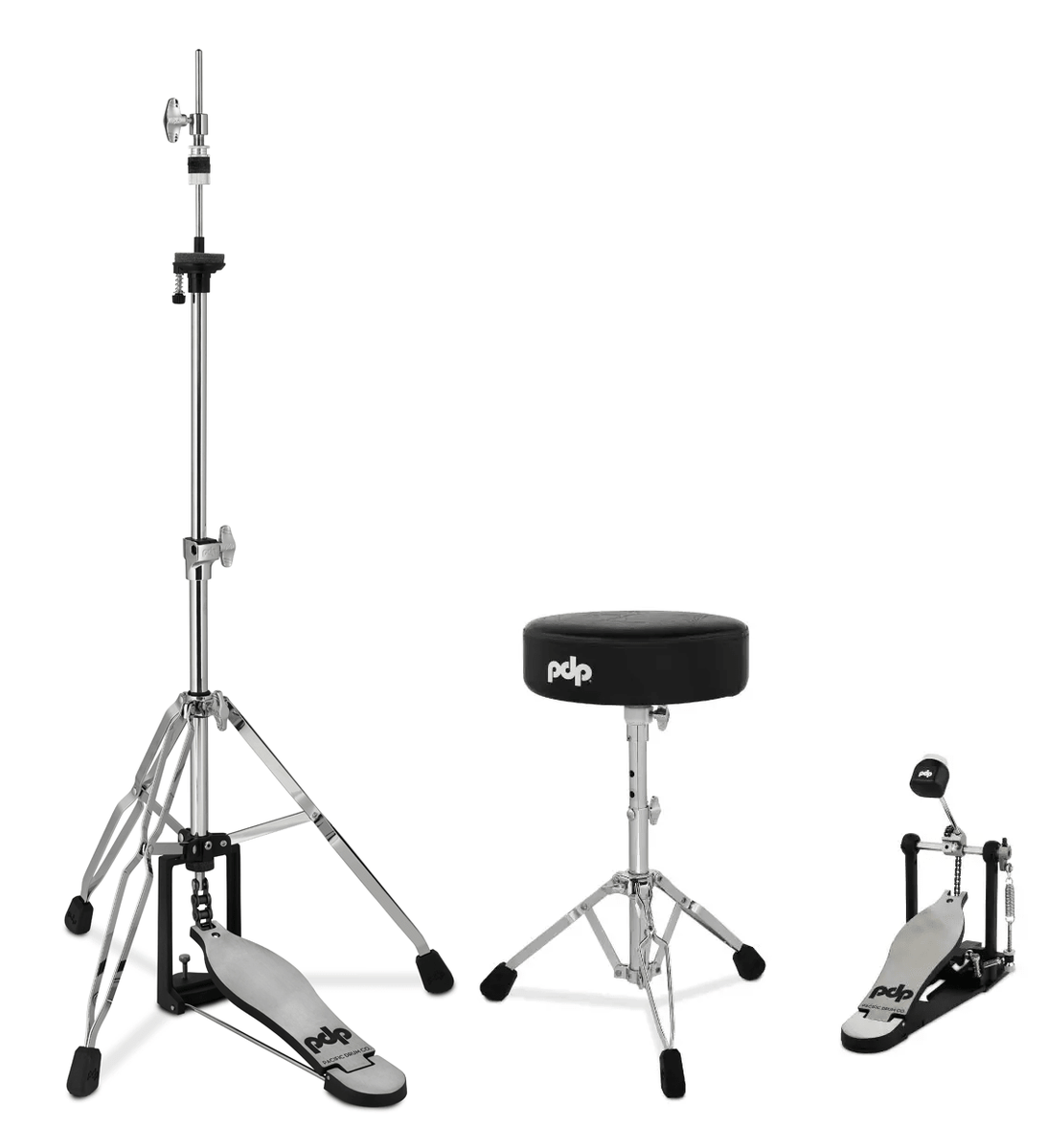 The PDP PDHWPK3SP 3-Piece 700 Series Hardware Pack includes a Single Pedal, a Hi-Hat Stand & Stool.