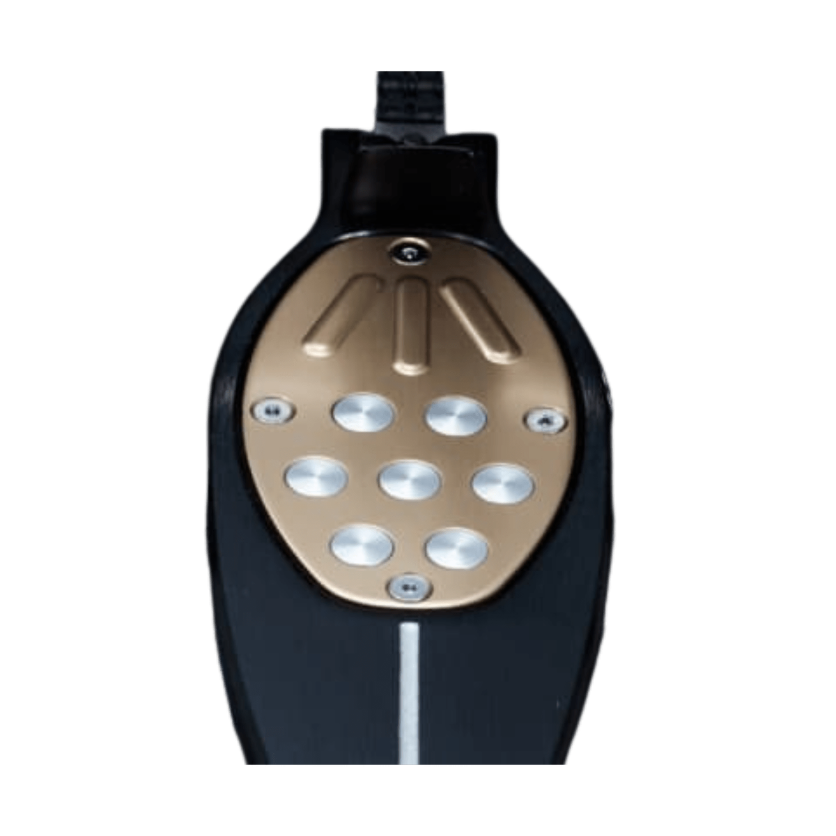The traction plate features a dull gold finish, making it stand out even on a dark stage.