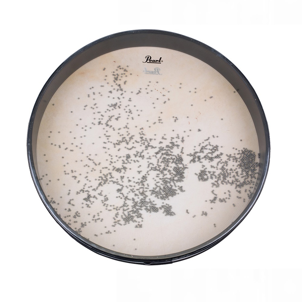 The natural Goat Skin head produces a more controlled sound while the clear Mylar head generates greater projection. Rolling the steel balls at different speeds, and starting and stopping produces sounds from soothing wave to crashing tides.
