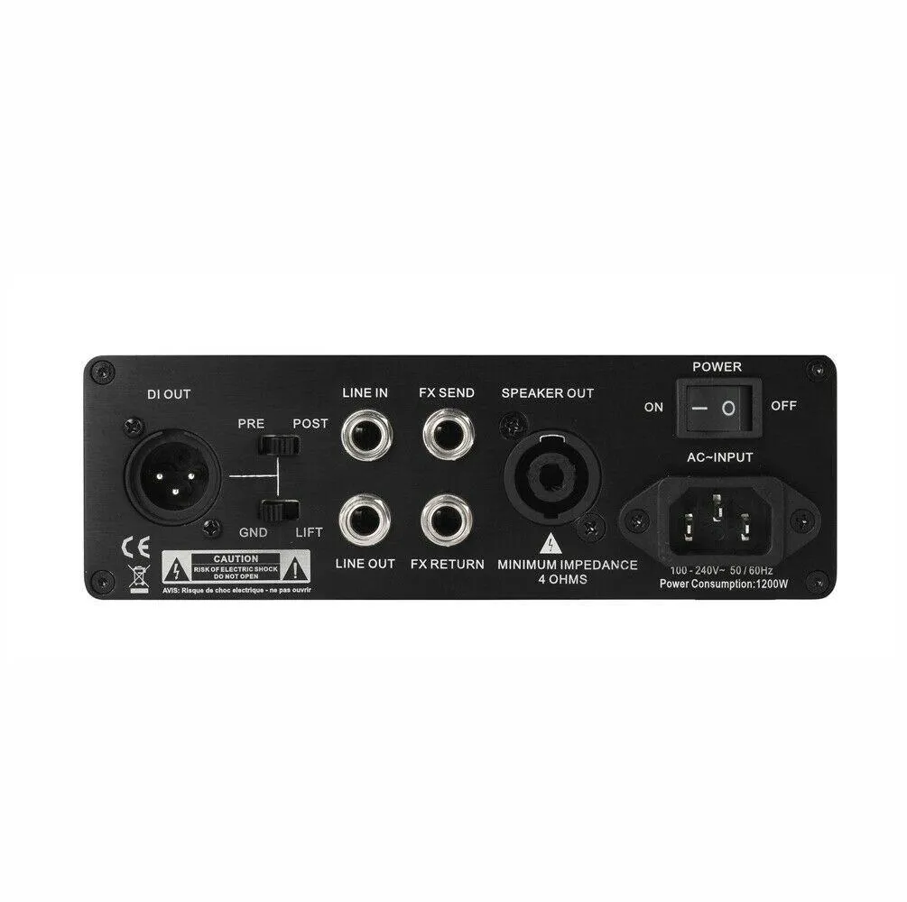 Other features include Mute /Passive/Active Switch, Headphone out and auxiliary input jacks, Balanced line out with pre/post EQ and ground lift switches, FX send/return Jacks, Pre Amp out and Power amp input jacks and a High-Current Speakon Out.