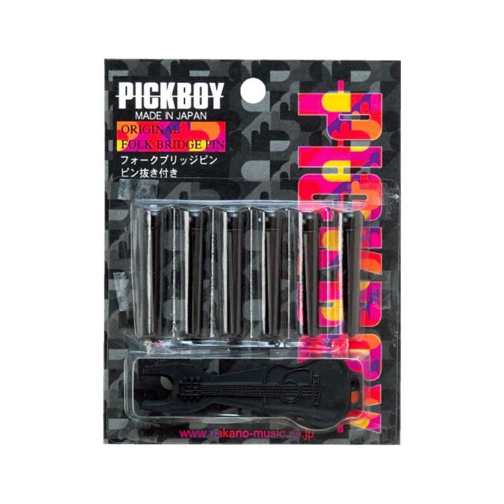Pickboy Bridge Pin Set. White with black dot. Attractively packaged, bridge pins in packets of six. Supplied with useful pinpry tool for lifting pins. Made in Japan by Pickboy.