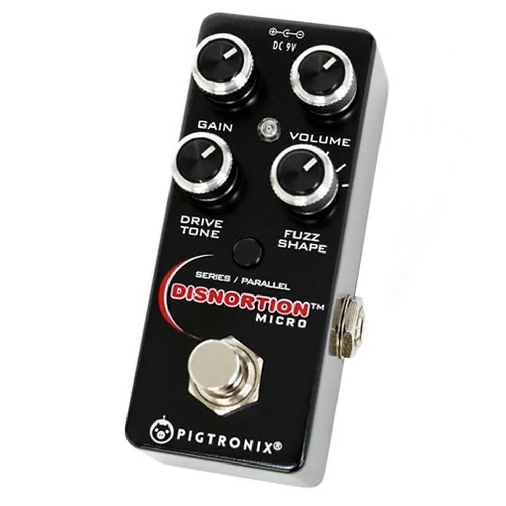 Pigtronix OFM Disnortion Micro Analog Fuzz & Overdrive Guitar Effects PedalThePigtronix Disnortion Micro packs all the sonic glory and 18V headroom of the original analog Fuzz and Overdrive circuits from the large-formatDisnortion pedal into a miniature version that runs on 9-volts. The original, 3-footswitch Disnortion pedal was in production from 2005 to 2015 and remains in constant use with world-class bands such as Queens of the Stone Age, Aerosmith, Living Colour and Muse. Thisnew micro version of the Disnortion hugely one-ups the original’s broadpalette of touch responsive dirt sounds by including the ability to switch from a parallel routing to a new, super-saturated series routing where the 6-stage CMOS overdrive circuit is cascaded into unique Pigtronix diode-clipping fuzz, and then output through a 6-way passive filter network. A single-gain knob controls the saturation of both the fuzz and overdrive circuits simultaneously. The Parallel routing mode isideal for players who like to pile on the gain without sacrificing clarity, dynamic response, punch or low end–it’s like double-tracking your guitar inside a micro pedal! The Series routing mode offers an evenwider range of gain and more extreme filter effects for metal tones andbeyond, including self-oscillating timbres that can be modulated by pickup selection and guitar control settings. TheCMOS overdrive found in the Disnortion Micro responds to the dynamics of your playing using a unique, 6-stage gain architecture that retains the natural tone of your instrument while adding tube-style breakup as you play louder. Pigtronix Fuzz has a unique diode-clipping architecturedesigned to deliver compression and controllable feedback while preserving the dynamics of your playing style. The rotary tone control filter switch provides 6 musical EQ curves using a complex passive network which compliments the Overdrive channel’s traditional low-pass filter. Theoriginal Pigtronix Disnortion is loved for its limitless headroom, making it compatible with any instrument, from the weakest 60’s pawnshopsingle coils to the most belligerent humbuckers, as well as 5-string active basses and modern synth rigs. Pigtronix Disnortion Micro achievesthis world-class performance standard using standard 9v power… and fitsin your pocket! Filter Modes: 1 No Filter FEATURES