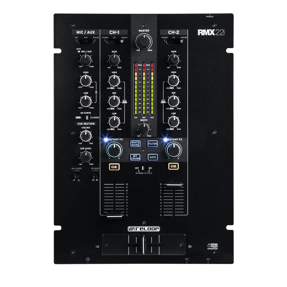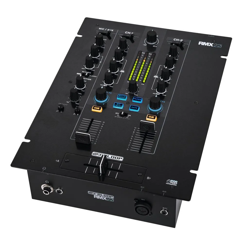 The Reloop RMX-22i is a 2+1 channel DJ mixer with digital audio architecture and integrated Instant Sound Colour effects. This compact club-style mixer benefits from the same high-quality build and sound characteristics that are already found on the flagship RMX-80 Digital mixer.
