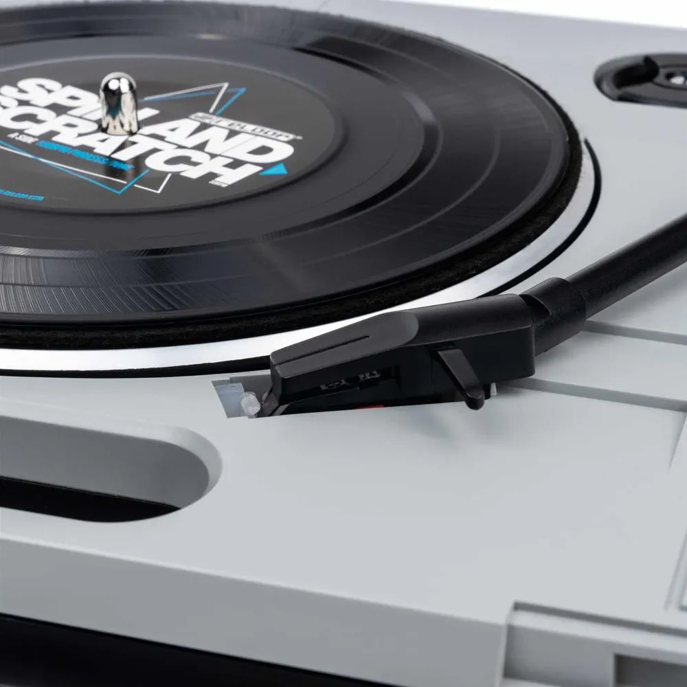 The Reloop SPIN is a portable turntable that guarantees mobile fun anywhere you want! The turntable comes with everything you need out of the box, including an exclusive 7“ scratch vinyl for beginners and experienced artists alike. Supporting 3 playback speeds (33, 45, and 78 RPM) with a 7″ puck adapter, allowing you to play and perform with your favourite vinyl records. The included scratch vinyl, AUX input, and pre-installed 45mm crossfader lets you cut and scratch right from the box with no additional hardware needed. The perfect turntable for portability and scratch DJs wanting a reliable and portable deck.