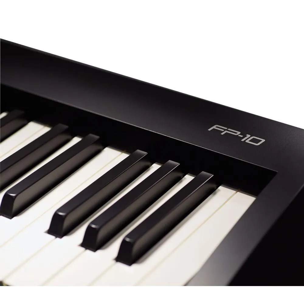 When inspiration strikes, sit down with the latest model in Roland's acclaimed FP series of pianos; the entry level model FP-10. This affordable digital piano is always ready to play with the reassuring authentic feel from the 88-key PHA-4 standard keyboard, and Roland's atmospheric SuperNATURAL piano tones played through the built-in speaker or headphones. With its portable, space-saving design, the FP-10 is the perfect instrument for home use, whether you're practising technique in your guest room or playing for guests in your living room. With Bluetooth® connectivity and powerful built-in features not found in other digital models in this price range, the FP-10 is the ideal second piano for experienced players.