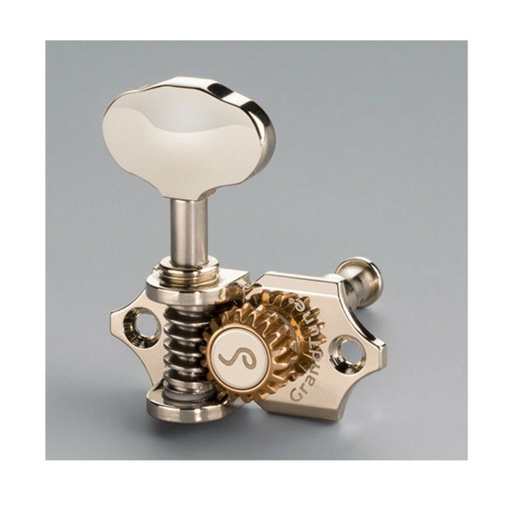 The all new Schaller GrandTune is the ultimate combination of tasteful design and velvet-smooth feel and touch. Set of 3-a-side single heads in nickel with butterbean nickel buttons and white nylon shaft for classical slotted headstock.