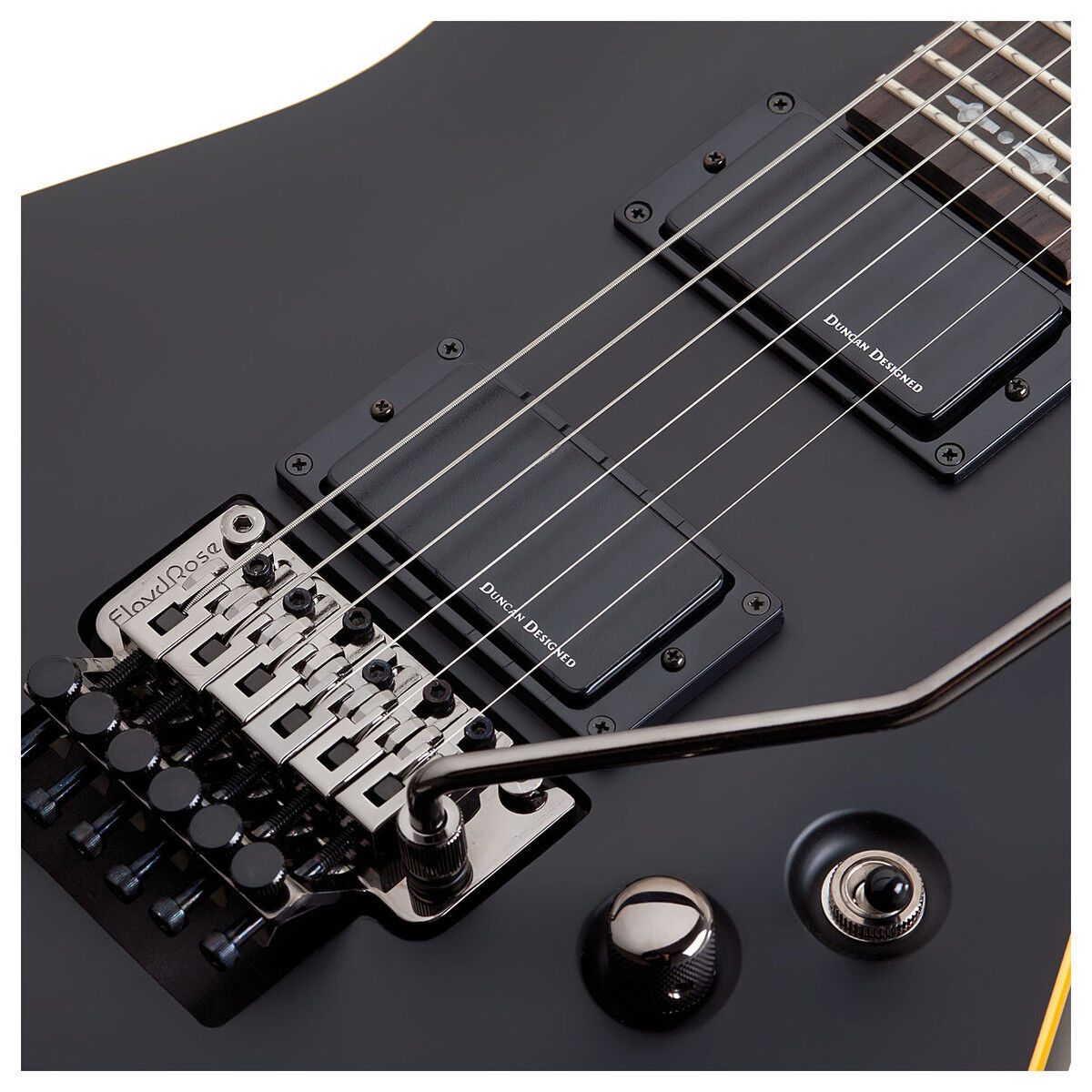 Give your chords the fuel they need. Let your sound soar. Duncan Designed Active HB-105 humbuckers allow for such a feat. They are based on the popular Seymour Duncan Blackout active humbucker and deliver a thrilling tone that is full of booming, roaring lows and face-scrunching, defined highs. Balanced across the frequency range, these high output pickups are capable of pretty much anything. One thing's for certain though. Its sound is addictive. And for even more string tension, clarity, and sustain, there's a Floyd Rose Special bridge and nut, which also presents tremendous opportunity to pitch bend and divebomb with pure, exhilarating fearlessness.