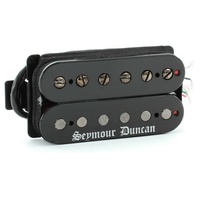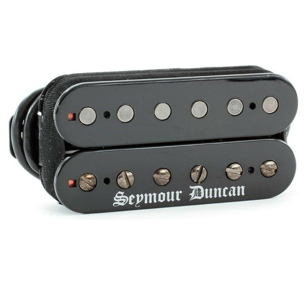 These pickups look as sharp as they sound. The Seymour Duncan logo is written in Old English font and features a black bottom plate, black poles, and black screws.