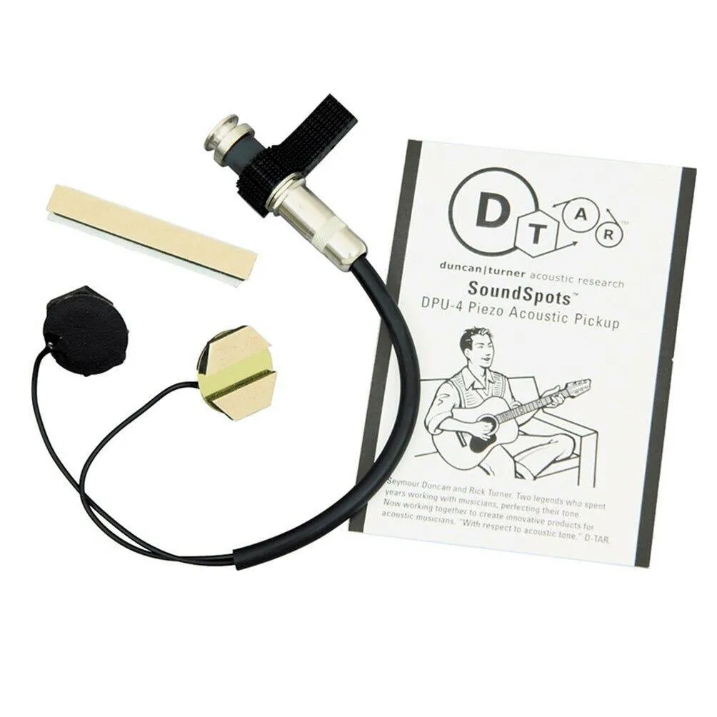 The D-TAR Banjo Soundspot Pickup faithfully delivers the sound of any banjo. Simply place the Sounspot pickup under the bridge's feet to capture all nuances of your banjo. SoundSpots are ultra-sensitive piezo crystal transducer pickups suitable for stringed and non-stringed acoustic and ethnic instruments. Unlike other dot-type transducer pickups, each SoundSpot is hand ground to extremely fine tolerances. This process, along with the selection of materials, yields a pickup with a very thin surface that can maintains its strength and flexibility. The result is a transducer that is ultra-sensitive to a banjo's surface vibrations and, therefore, is extremely natural and warm sounding.D-TAR - Duncan/Turner Acoustic ResearchSeymour Duncan and Rick Turner are two legends who spent years working with musicians, perfecting their tone. Seymour founded his self-named company in 1978 which has become well-known for its wide variety of guitar and bass pickups used by just about every name player from Billie Joe Armstrong to Angus Young. Rick co-founded Alembic, was president of Gibson Labs West Coast R&D Division, co-founded Highlander Musical Audio making piezo acoustic guitar pickups for Lindsay Buckingham, Ry Cooder, David Lindley, and Andy Summers, and runs his own Renaissance Guitars. Now Seymour and Rick are working together to create innovative products for acoustic musicians. Their D-TAR motto: "With respect to acoustic tone."