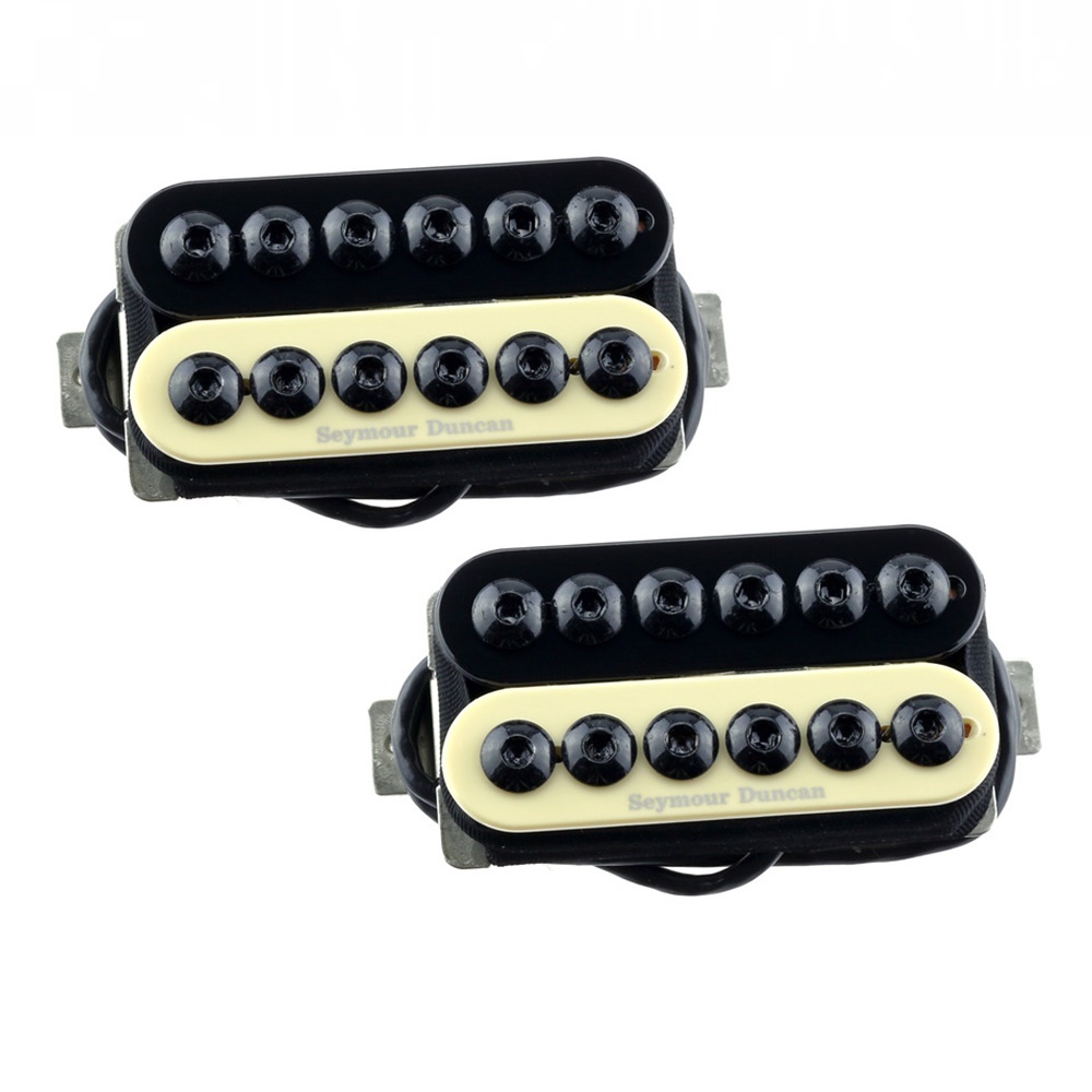 This set includes the SH-8b Invader Bridge pickup and the matching SH-8n Invader Neck pickup. The Seymour Duncan SH-8b Invader is an ultra high output humbucker built for aggressive playing styles. Recommended for punk, garage, thrash, metal and other heavy rock styles. The SH-8b is designed for the heaviest tones a passive pickup can produce. The combination of three ceramic magnets, over-wound coils and twelve black oxide cap screws make the Invader an electrifying force of energy. The wide magnetic field pumps power into your amp with a totally heavy sound. Comes with four-conductor hookup cable. The SH-8n Invader neck pickup has considerably reduced output for tonal versatility. For all instruments. The wide pole pieces work for both humbucker and Trembucker string spacing. Players include Troy VanLeeuwen / Queens of the Stone Age (bridge), Mike Chlasciak / Halford (bridge), Whitey Kirst / Iggy Pop (bridge), Rick Jackett / finger eleven (bridge), Will Adler & Mark Morton / Lamb of God (bridge). 21 Day Real World Exchange Policy Purchase and install this pickup and check it out with your own gear, in places you normally play - concert halls, the studio, your bedroom - wherever.