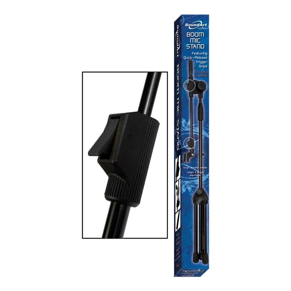 The Soundart Deluxe Tripod Boom Microphone Stand features a durable, heavy duty tripod base, quick-release trigger grips, as well as height and length adjustability.