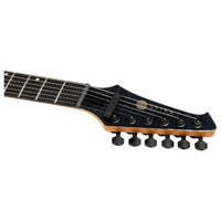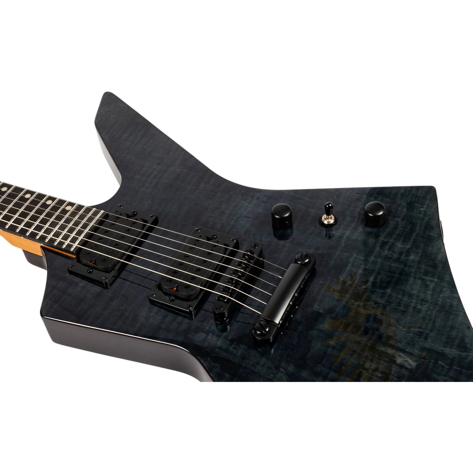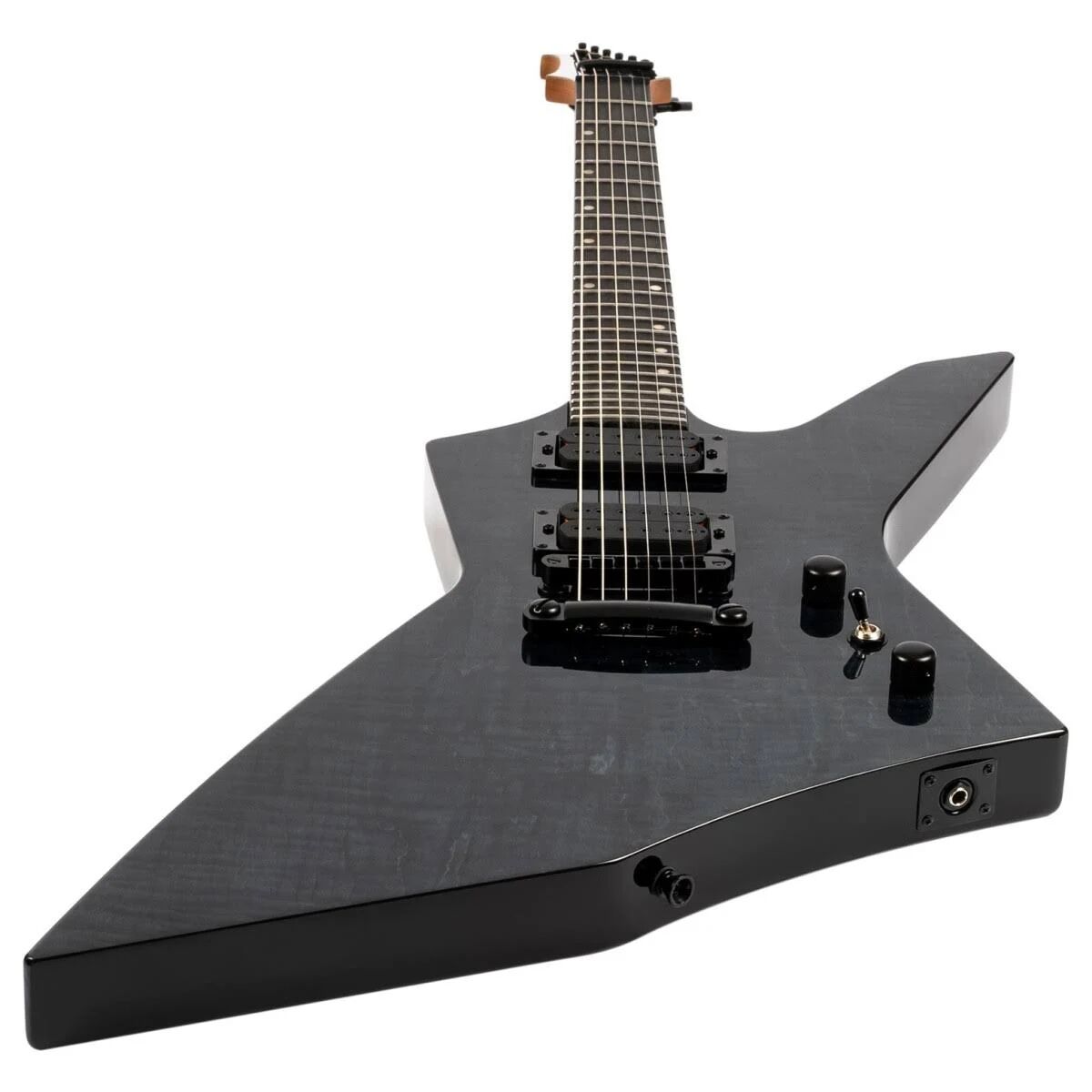 The Spira Guitars X-500 TBK E in Transparent Black brings aggressive design and premium specs together in a striking Explorer-style electric guitar. A mahogany body with flamed maple top delivers powerful, resonant tone, while the satin-finished Canadian roasted maple neck and Ebony Tech fretboard with 24 jumbo frets offer fast, smooth playability. Spira’s high-output Villain humbuckers provide clear, crushing tone with excellent dynamic response, even under heavy distortion. With a fixed bridge and locking tuners, the X-500 maintains rock-solid tuning and intonation in any performance setting. The gloss finish and sleek black hardware complete the X-500’s bold aesthetic.