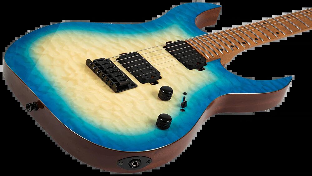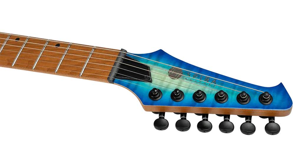 The S-500 is the pinnacle of the six string Spira lineup, meticulously designed for players who demand the highest level of performance and aesthetics. The S-500 features a luxurious mahogany body with a stunning quilted maple top, delivering both exceptional resonance and eye-catching beauty. The Canadian roasted maple neck and fretboard offer unmatched stability and a smooth, responsive playing experience, ideal for advanced techniques.