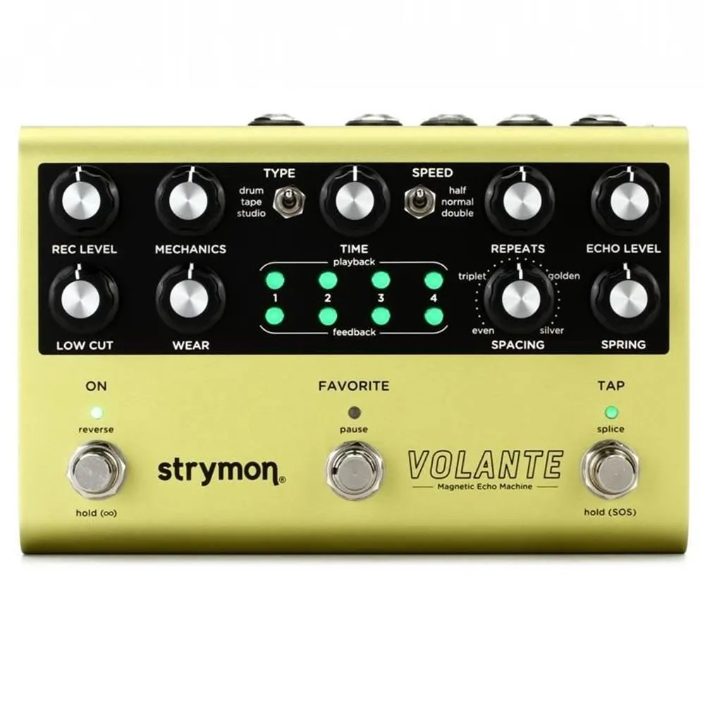 Strymon’s Volante delivers the full gamut of analog-style echoes — magnetic drum echo, tape echo, and reel-to-reel studio echo. It’s also a stereo multi-head delay with an onboard looper and independent vintage spring reverb. You can really dial in the vintage vibe with this pedal, from the natural saturation and soft clipping of overdriven magnetic media to mechanics, wear, head spacing, machine speed, and more. Enjoy complete control of every parameter via MIDI. Store up to 300 presets. Take command via expression pedal — Volante is primed for maximum emotional expression. Beyond that, instrument/line-level capabilities make it equally at home on your pedalboard or in the studio. Volante includes tap tempo, 24-bit/96kHz sound quality, and selectable true bypass/analog buffered bypass switching — it’s one of the most feature-packed delays on the market.