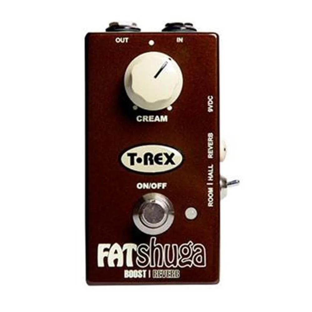 Get gutsy tube grit and swirling vintage reverbs from your amp with the T-Rex Fat Shuga. This 2-in-1 boost/reverb pedal breathes new life into any tube amp, adding depth, saturation, and texture to your chords and leads. The Fat Shuga's boost and reverb circuits function independently with separate gain and reverb levels, but they are tone-tailored to complement one another as they interact. If you're in the market for both a boost pedal and a reverb. we recommend the Fat Shuga