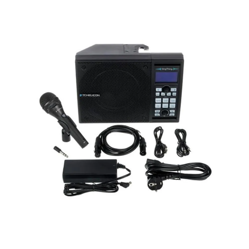 Right out of the box, the TC-Helicon SingThing is ready to rock. It includes TC's MP-75 Modern Performance vocal microphone with a built-in control for engaging SingThing's vocal effects. You'll also receive an XLR cable to hook up the mic, 1/8" aux cables for connecting a keyboard or music player, and an 1/8" to 1/4" adapter.