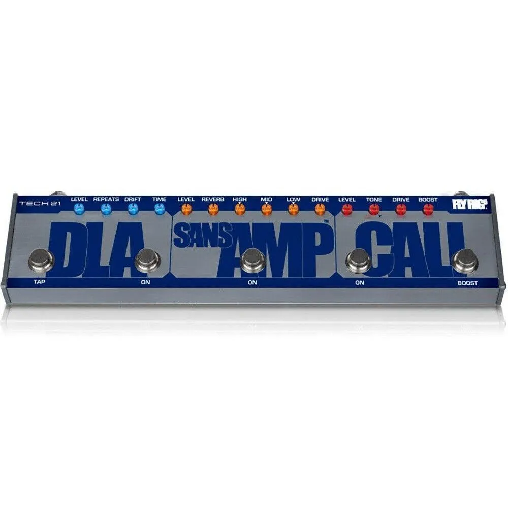 Tech21 Fly Rig 5-Cali Guitar Effects PedalSansAmp tubeamplifier emulator, is pre-voiced for clean tones. It includes 3-bandactive EQ, Level, andDrive to adjust the overall amount of gain and overdrive. • Reverb,within the SansAmp section, is based upon the Boost RVB pedal. Itemulates the rich ambiances of a vintage spring reverb without clatterypings, canyons of doom, or other annoying artifacts. • Boost,kicks in up to 21dB of pre-amp gain. It can be used independently toboost the SansAmp and/or DLA functions, as well as on its own to boostthe gain of your amp. • DLA isbased upon the Boost DLA pedal. It is voiced to give you the sounds ofa vintage tape echo • Allanalog signal path; reverb and delay are mixed in parallel. •Get 5 “must-have” gigging pedals for 1/3 the cost at 1/3 the size,without sacrificing pro quality tone. •All metal housing in gunmetal finish. •Metal footswitches and jacks. •1/4-inch high-impedance input. •1/4-inch low impedance output. •Silent-switching, custom footswitch actuators. •Utilizes included “auto-switching” 12V DC power supply. Self-adjusts to100V-240V. It can be used anywhere in the world with the properplug/travel adapter for the host country. •The Fly Rig 5 is shipped with 4 knob grippers, one on each Levelcontrol. Additional knob grippers are sold in packs of 10 on our Accessories page. | |||