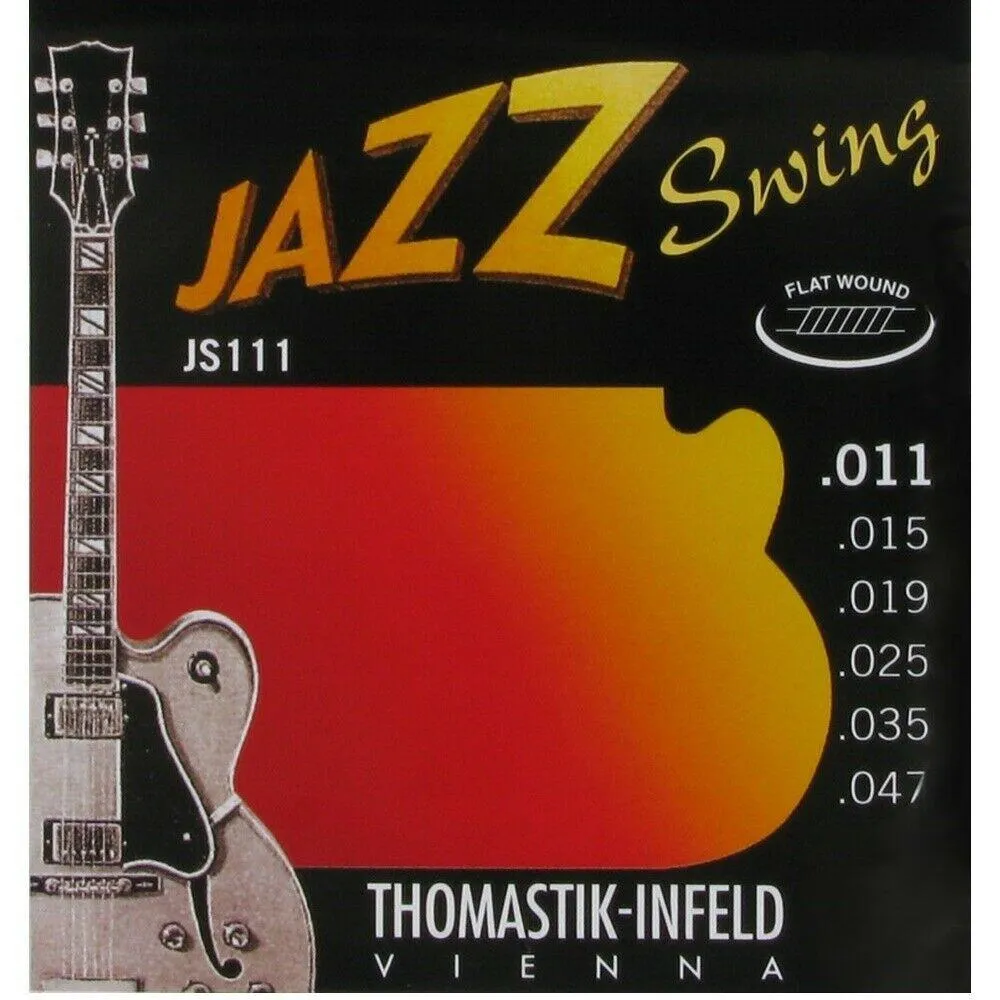Thomastik-Infeld Jazz Swing Flatwound Electric Guitar Strings are a benchmark for professional jazz guitarists seeking a smooth feel, warm tone, and exceptional tuning stability. The light 11–47 gauge provides effortless playability while retaining the rich, full-bodied sound flatwound strings are known for.