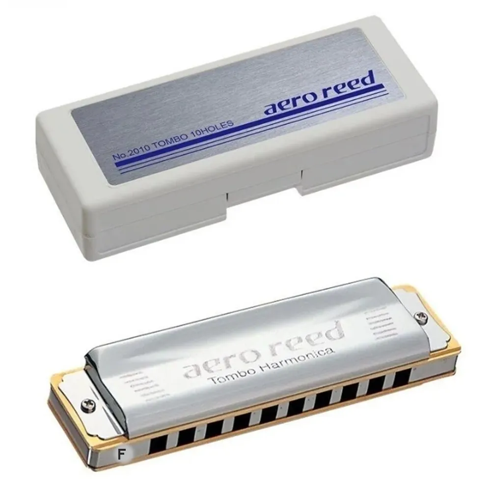 The TOMBO Aero Reed Harmonica Key of F (2010F) is a 10-hole diatonic harmonica made in Japan, offering clear projection, quick reed response, and expressive bending ideal for blues, rock, and folk styles.