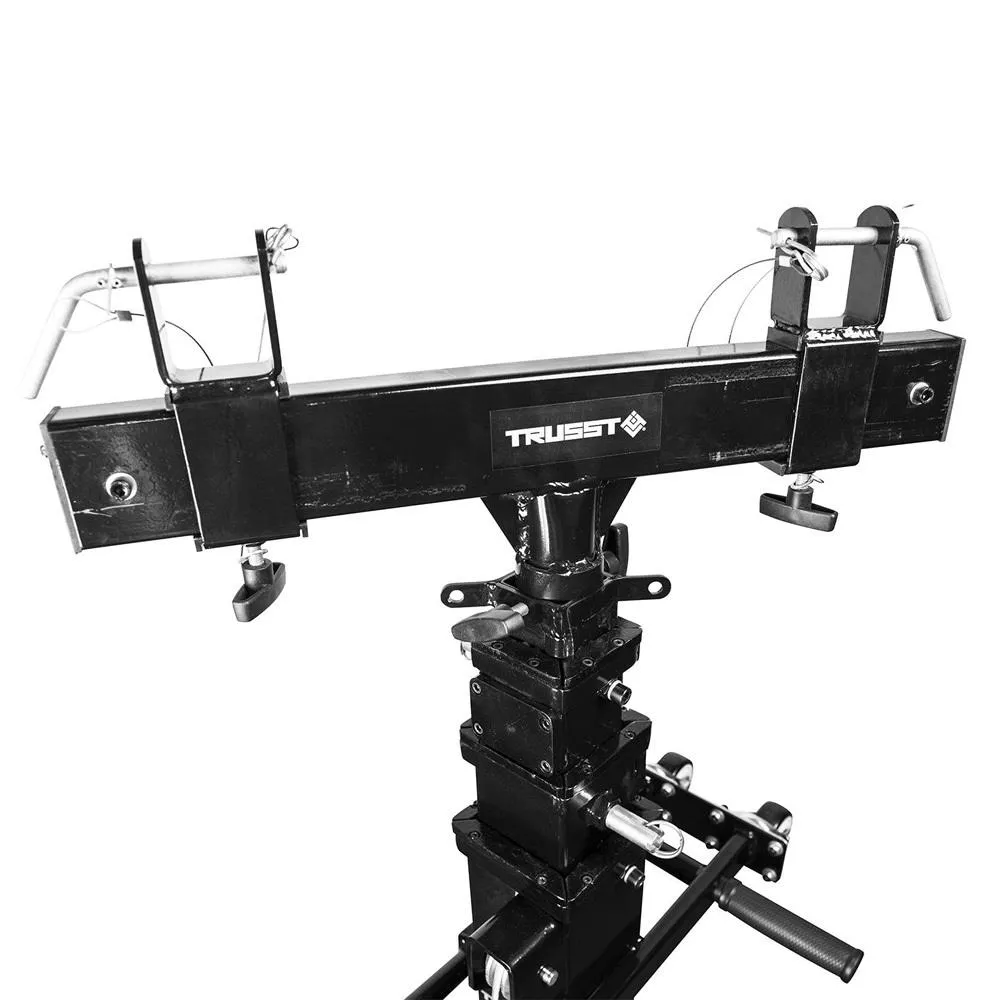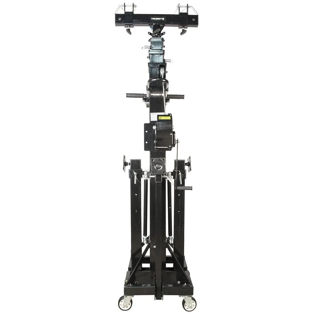 The TRUSST® Crank Tower 6.0 is a crank up tower stand with a maximum height of 6 meters (19.7 ft). It is capable of lifting and supporting up to 250 kg (550 lbs) safely. Constructed almost entirely of metal, there are no plastic parts to break or strip. The Crank Tower 6.0 comes complete with a T-bar adaptor. The T-bar adaptor is adjustable to fit multiple sizes of truss. The rubber coated feet and polyurethane wheels help protect flooring surfaces from scratches. The built-in safety locks and integrated winch brake prevent the load from coming down uncontrollably.