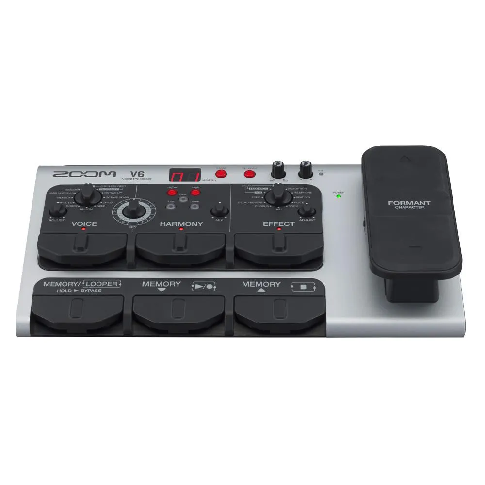 The Zoom V6 Vocal Processor Vocal Effects Pedal is a powerful all-in-one vocal effects and harmony processor featuring studio-quality voice processing, built-in looper, expressive effects control, and 40 presets for live performance and recording.
